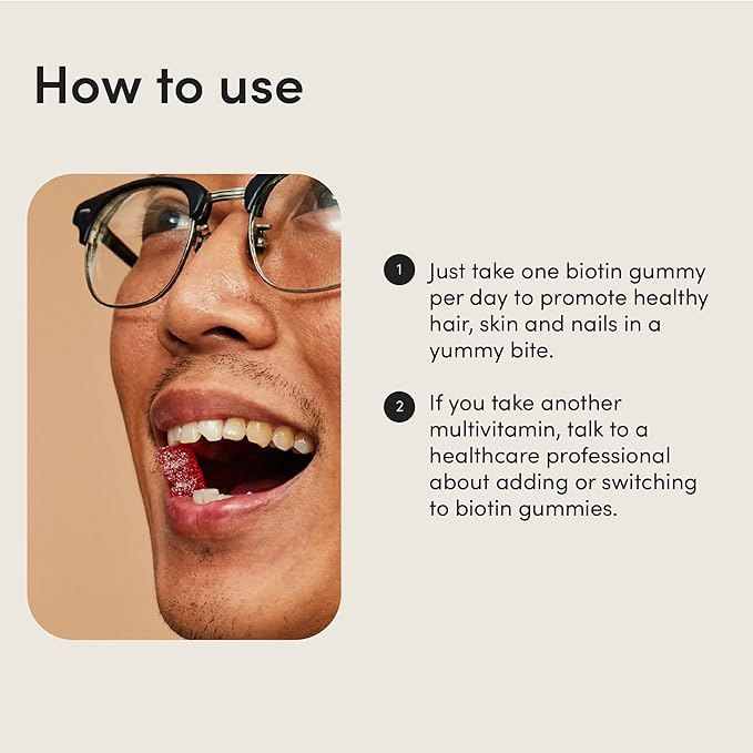 • Take 1 biotin gummy per day to promote healthy hair, skin and nails in a yummy bite. Take only the recommended amount. hims & hers biotin gummies are not intended to treat hair loss, but they can deliver nutrients to support a healthy head of hair
